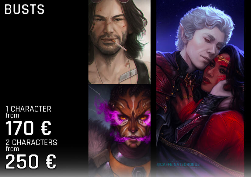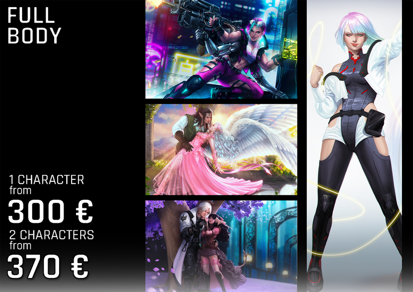 This category includes pieces like horizontal splash-style or action scene artworks, with multiple characters & extras (like enemies, etc) &/or very detail heavy, elaborated settings; or large format print-quality decorative style posters like my BG3 series. The cost is motivated by the amount of work that goes into the study of the composition and then the creation, given the amount of detailing and elements. The price is an approximate for 1 main character + some extras or equivalents, I can give you a final quote after understanding your idea (or come up with something to work within budget)