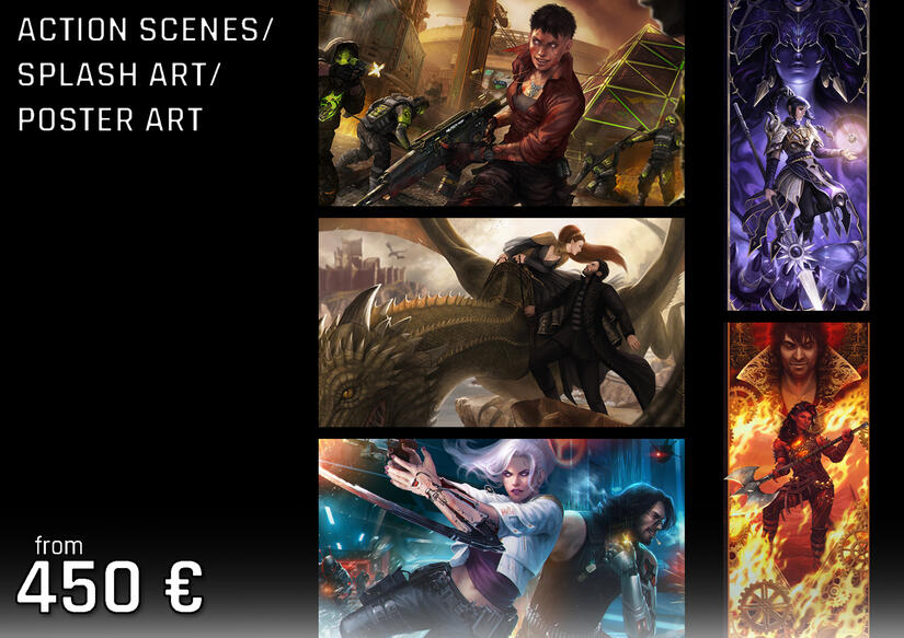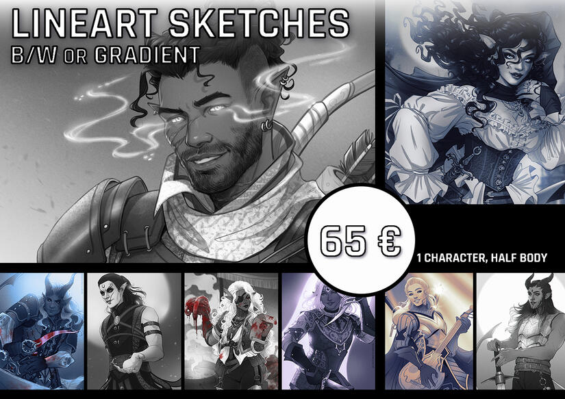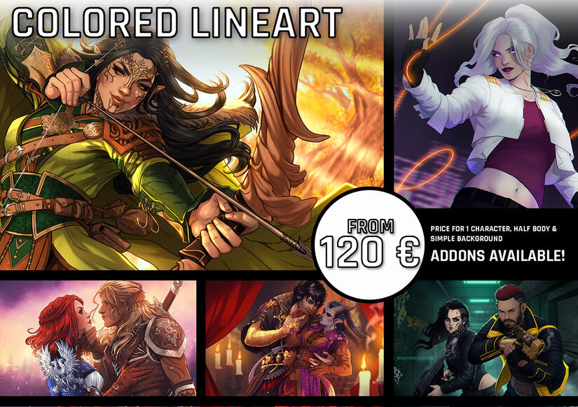 The examples shown are indicative of my skill level/general style of figure painting; however I love working with any idea, from more decorative style pieces to realistic setting style illystrationd ;) All prices include a background of your choice! Please note however that extra costs might apply for very complicated background or additions of a lot of detailed items/props/etc., and for extensive character design.